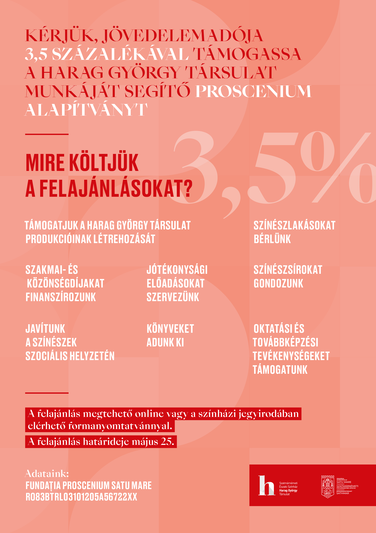 Kérjük, idén a felajánlható 3,5 százalékkal támogassa a Harag György Társulat munkáját segítő Proscenium Alapítványt, vagy a Brighella Bábtagozatot segítő Art Project Egyesületet! -